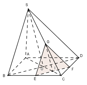 \(\left\{ \begin{array}{l}\dfrac{{IC}}{{OC}} = \dfrac{{FE}}{{BD}} = \dfrac{{GC}}{{SC}} = \dfrac{{GE}}{{SB}} = \dfrac{{GF}}{{SD}}\\BD = SB = SD\end{array} \right. \Rightarrow GE = GF = EF \Rightarrow \Delta GEF\) đều và \(\dfrac{{IC}}{{OC}} = \dfrac{{EF}}{{BD}}\) \( \Rightarrow EF = \dfrac{{IC}}{{OC}}.BD = \dfrac{{a - x}}{{\frac{a}{2}}}.b = \dfrac{{2b\left( {a - x} \right)}}{a}\)