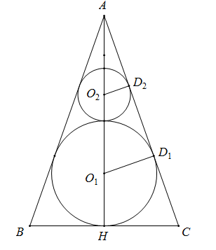 Gọi $H$ là tâm đường tròn đáy của hình nón, ${O_1},{O_2}$ lần lượt là tâm của mặt cầu lớn và nhỏ, ${D_1},{D_2}$ lần lượt là tiếp điểm của $AC$ với $\left( {{O_1}} \right)$ và $\left( {{O_2}} \right)$.