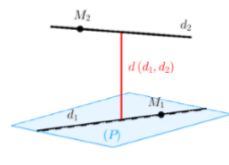 \(d({d_1};{d_2}) = \dfrac{{\left| {\overrightarrow {{M_1}{M_2}} .\left[ {\overrightarrow {{u_1}} ;\overrightarrow {{u_2}} } \right]} \right|}}{{\left| {\left[ {\overrightarrow {{u_1}} ;\overrightarrow {{u_2}} } \right]} \right|}}\)