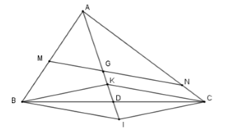 Qua B, C kẻ các đường thẳng song song với \(MN\) cắt đường thẳng \(AG\) tại \(K\) và \(I.\) Gọi \(D\) là trung điểm \(BC.\)