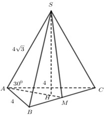 Xét tam giác \(SAB\) có: \(S{B^2} = S{A^2} + A{B^2} - 2SA.AB\cos {30^0} = 16 \Rightarrow SB = 4 \Rightarrow SC = 4\).