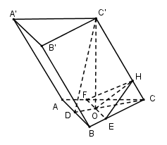 Ta có: \(\left. \begin{array}{l}\left( {ACC'A'} \right) \cap \left( {BCC'B'} \right) = CC'\\\left( {ACC'A'} \right) \supset HF \bot CC'\\\left( {BCC'B'} \right) \supset HE \bot CC'\end{array} \right\} \Rightarrow \widehat {\left( {\left( {ACC'A'} \right);\left( {BCC'B'} \right)} \right)} = \widehat {\left( {HF;HE} \right)} = {90^0} \Rightarrow HE \bot HF\)