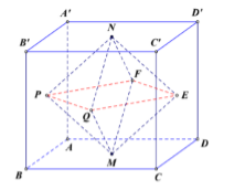 Dễ thấy \(MNPQEF\) là khối bát diện đều cạnh cạnh \(QE = \dfrac{1}{2}BD = \dfrac{{\sqrt 2 }}{2}\).