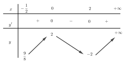Xét hàm $y = {x^3} - 3{x^2} + 2$ trên khoảng \(\left( { - \dfrac{1}{2}; + \infty } \right)\) có \(y' = 3{x^2} - 6x = 0 \Leftrightarrow \left[ \begin{array}{l}x = 0\left( {TM} \right)\\x = 2\left( {TM} \right)\end{array} \right.\)