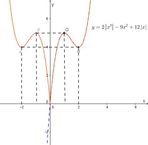 Ta có đồ thị hàm số $y = 2{\left| x \right|^3} - 9{x^2} + 12\left| x \right|$: