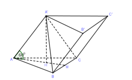 Gọi $A'H$ là chiều cao của lăng trụ, suy ra $H$ là trọng tâm $\Delta ABC,\widehat {A'AH} = 60^\circ $.
