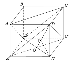 $ \Rightarrow d\left( {\left( {AB'C} \right),\left( {A'DC'} \right)} \right) = d\left( {D',\left( {A'DC'} \right)} \right) = D'I = \dfrac{{D'O'.D'D}}{{\sqrt {D'{{O'}^2} + D'{D^2}} }} = \dfrac{{\dfrac{{a\sqrt 2 }}{2}.a}}{{\sqrt {{{\left( {\dfrac{{a\sqrt 2 }}{2}} \right)}^2} + {a^2}} }} = \dfrac{{a\sqrt 3 }}{3}.$