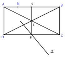 Trong mặt phẳng với hệ tọa độ $Oxy,$ cho hình chữ nhật $ABCD$ có điểm $I\left( {6;2} \right)$ là giao điểm của $2$ đường chéo $AC$ và $BD.$ Điểm $M\left( {1;5} \right)$ thuộc đường thẳng $AB$ và trung điểm $E$ của cạnh $CD$ thuộc đường thẳng $\Delta :x + y-5 = 0.$ Viết phương trình đường thẳng $AB.$