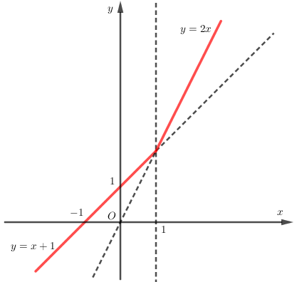 Hàm số $y = \left\{ \begin{array}{l}2x \text{ khi } x \ge 1\\x + 1 \text{ khi } x < 1\end{array} \right.$ có đồ thị