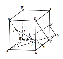 Xét phép chiếu song song lên $\left( {ABCD} \right)$theo phương chiếu $A'B$. Khi đó ba điểm $J,I,M$ lần lượt có hình chiếu là $B,I',M$. Do $J,I,M$ thẳng hàng nên $B,I',M$ cũng thẳng hàng. Gọi $N'$ là hình chiếu của $N$ thì $AN'$ là hình chiếu của $AN$. Vì $I \in AN \Rightarrow I' \in AN' \Rightarrow I' = BM \cap AN'$.