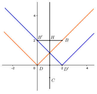 \( \Rightarrow x + y = 2\) là đường thẳng đối xứng với đường thẳng $y = x$ qua đường thẳng $x = 1$.