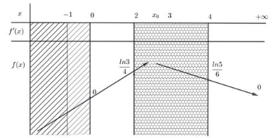 Xét \(f\left( x \right) = \dfrac{{\ln \left( {1 + x} \right)}}{{x + 2}}\) có \(f'\left( x \right) = \dfrac{{\dfrac{{x + 2}}{{x + 1}} - \ln \left( {x + 1} \right)}}{{{{\left( {x + 2} \right)}^2}}} = 0 \Leftrightarrow x = {x_0} \in \left( {2;3} \right)\) và \(\mathop {\lim }\limits_{x \to + \infty } f\left( x \right) = \mathop {\lim }\limits_{x \to + \infty } \dfrac{{\ln \left( {1 + x} \right)}}{{x + 2}} = 0\) nên ta có bảng biến thiên trên \(\left( { - 1; + \infty } \right)\) như sau: