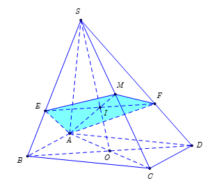 Gọi \(O = AC \cap BD\), \(I = SO \cap AM\). Trong mặt phẳng \(\left( {SBD} \right)\) qua \(I\) kẻ \(EF//BD\), khi đó ta có \(\left( {AEMF} \right) \equiv \left( \alpha \right)\) là mặt phẳng chứa \(AM\) và song song với \(BD\). Do đó thiết diện của hình chóp bị cắt bởi mặt phẳng \(\left( \alpha \right)\) là tứ giác \(AEMF\)