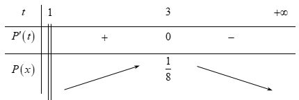 \(P'\left( t \right) = \dfrac{{ - {t^2} + 2t + 3}}{{{{\left( {t + 1} \right)}^4}}} = 0 \Leftrightarrow t = 3\)