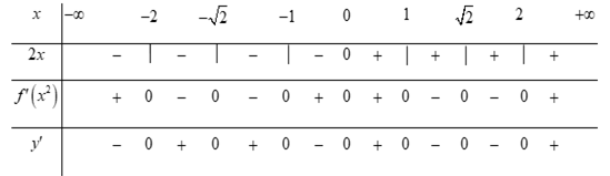 Do \(f'\left( {{x^2}} \right) > 0\)\( \Leftrightarrow \left[ \begin{array}{l}{x^2} > 4\\0 < {x^2} < 1\end{array} \right.\)\( \Leftrightarrow \left[ \begin{array}{l}x > 2\\x < - 2\\ - 1 < x < 1\end{array} \right.\) nên ta có bảng xét dấu dưới đây: