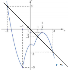 Dựa vào đồ thị hàm số, ta có: Đồ thị hàm số $f'(x)$ cắt đường thẳng $y = - x$ tại 3 điểm phân biệt là $A( - 3;3),\,\,B( - 1;1),\,\,C(3; - 3)$