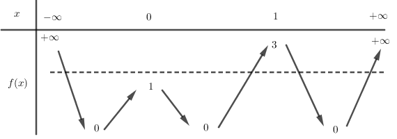 Từ BBT suy ra phương trình \(\left| {f\left( x \right) - 1} \right| = m\) có bốn nghiệm phân biệt khi \(1 < m < 3\).