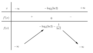 \( \Rightarrow g'\left( x \right) = 0 \Leftrightarrow 1 - {2^x}\ln 2 = 0 \Leftrightarrow {2^x} = \dfrac{1}{{\ln 2}}\) \( \Leftrightarrow x = {\log _2}\left( {\dfrac{1}{{\ln 2}}} \right) = - {\log _2}\left( {\ln 2} \right).\)