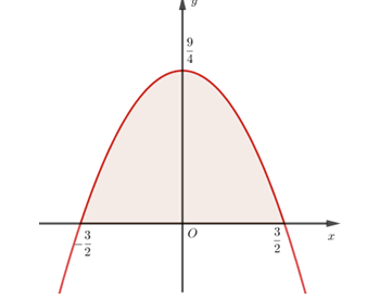 \(S = \int\limits_{\frac{{ - 3}}{2}}^{\frac{3}{2}} {\left( { - {x^2} + \dfrac{9}{4}} \right){d}x} \)\( = 2\int\limits_0^{\frac{3}{2}} {\left( { - {x^2} + \dfrac{9}{4}} \right){d}x} \)$ = \left. {2\left( {\dfrac{{ - {x^3}}}{3} + \dfrac{9}{4}x} \right)} \right|_0^{\frac{9}{4}}$ \( = \dfrac{9}{2}{{\rm{m}}^2}\)