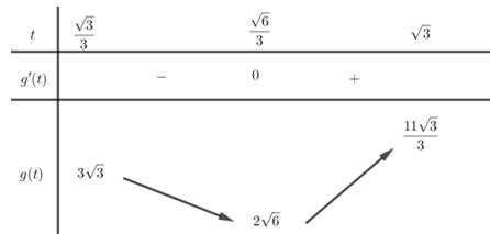Cho $g'\left( t \right) = 0 \Rightarrow t = \dfrac{{\sqrt 6 }}{3}$