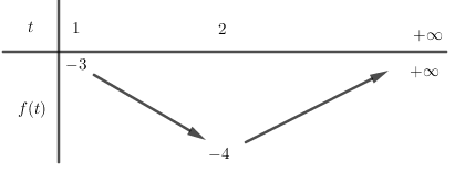 Xét hàm số \(f\left( t \right) = {t^2} - 4t\) có đồ thị là parabol có hoành độ đỉnh \(x = 2 \in \left( {1; + \infty } \right)\) nên ta có bảng biến thiên: