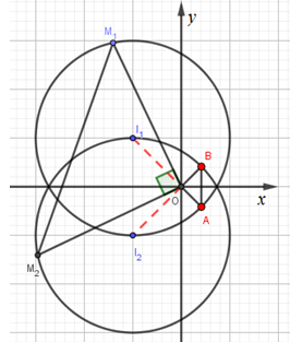 $ \Rightarrow {M_1},\,\,{M_2}$ lần lượt trùng với A, B; là giao điểm của $O{I_1},\,\,O{I_2}$ và $\left( {{I_1};R} \right);\,\left( {{I_2};R} \right)\,$, (A nằm khác phía ${I_1}$ so với O, B nằm khác phía ${I_2}$ so với O).