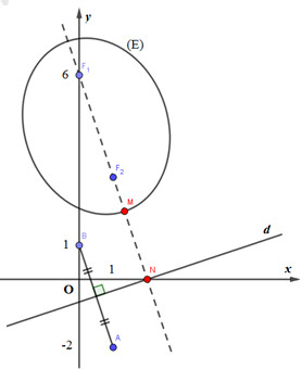 Giả sử \(M',\,\,N'\) lần lượt là điểm biểu diễn số phức \(u,\,\,v\) \( \Rightarrow M' \in (E),\,\,N' \in d\)