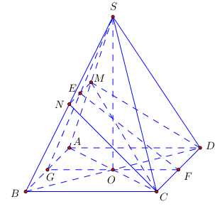 Đặt \(SA = SB = SC = SD = x\) ta có \(CN = \dfrac{{\sqrt {{x^2} + 2{a^2}} }}{2}\)