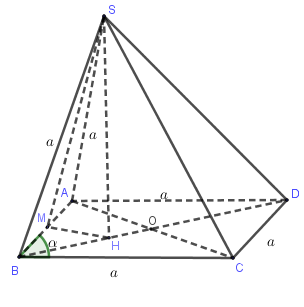 \( \Rightarrow M{H^2} = \dfrac{{A{O^2}.B{M^2}}}{{B{O^2}}} = \dfrac{{\dfrac{{{a^2}\left( {1 - \cos \alpha } \right)}}{2}.\dfrac{{{a^2}}}{4}}}{{\dfrac{{{a^2}\left( {1 + \cos \alpha } \right)}}{2}}} = \dfrac{{{a^2}\left( {1 - \cos \alpha } \right)}}{{4\left( {1 + \cos \alpha } \right)}}\)