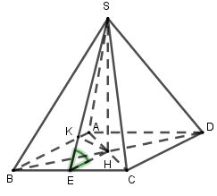 \(\begin{array}{l} \Rightarrow HE = \dfrac{{HK}}{{\cos 45}} = a\sqrt 2 \\ \Rightarrow AB = 2HE = 2a\sqrt 2 \Rightarrow {S_{ABCD}} = 8{a^2}\\SH = HE.\tan 45 = a\sqrt 2 \\ \Rightarrow {V_{S.ABCD}} = \dfrac{1}{3}.a\sqrt 2 .8{a^2} = \dfrac{{8{a^3}\sqrt 2 }}{3}\end{array}\)