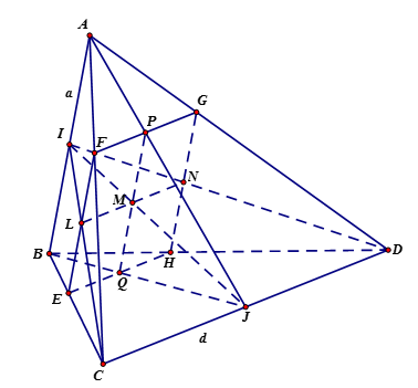 Tương tự $\dfrac{{PQ}}{{AB}} = \dfrac{{JM}}{{JI}} = \dfrac{2}{3}$$ \Rightarrow PQ = \dfrac{2}{3}AB = \dfrac{{2a}}{3}$.