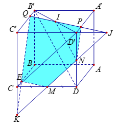 Trong \(\left( {A'B'C'D'} \right)\) nối \(IJ\)cắt \(A'D'\) tại \(P\) ,cắt \(C'B'\) tại \(Q\) .
