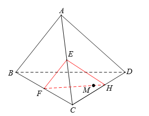 Cho tứ diện \(ABCD\). Gọi \(E\), \(F\) lần lượt là trung điểm của các cạnh \(AC\) và \(BC\). Trên mặt phẳng \(\left( {BCD} \right)\) lấy một điểm \(M\) tùy ý (điểm \(M\) có đánh dấu tròn như hình vẽ). Nêu đầy đủ các trường hợp (TH) để thiết diện tạo bởi mặt phẳng \(\left( {MEF} \right)\) với tứ diện \(ABCD\) là một tứ giác.