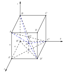 \(\begin{array}{l}B'\left( {0;\;0;\;0} \right),\;\;A'\left( {a;\;0;\;0} \right),\;C'\left( {0;\;a;\;0} \right),\;D'\left( {a;\;a;\;0} \right),\\A\left( {a;\;0;\;a} \right),\;I\left( {\dfrac{a}{2};\;\dfrac{a}{2};\;0} \right),\;B\left( {0;\;0;\;a} \right),\;O\left( {\dfrac{a}{2};\;\dfrac{a}{2};\;\dfrac{a}{2}} \right).\\ \Rightarrow \overrightarrow {OI} = \left( {0;\;0;\;\dfrac{a}{2}} \right) \Rightarrow \overrightarrow {OM} = \dfrac{2}{3}\overrightarrow {OI} = \left( {0;\;0;\;\dfrac{a}{6}} \right).\\ \Rightarrow \left\{ \begin{array}{l}{x_M} - {x_O} = 0\\{y_M} - {y_O} = 0\\{z_M} - {z_O} = \dfrac{a}{6}\end{array} \right. \Rightarrow \left\{ \begin{array}{l}{x_M} = \dfrac{a}{2}\\{y_M} = \dfrac{a}{2}\\{z_M} = \dfrac{{2a}}{3}\end{array} \right. \Rightarrow M\left( {\dfrac{a}{2};\;\dfrac{a}{2};\;\dfrac{{2a}}{3}} \right).\end{array}\)
