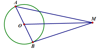Ta có \(MA = \sqrt {M{O^2} + A{O^2} - 2MO.AO.\cos \alpha } = \sqrt {9{R^2} + {R^2} - 6{R^2}\cos \alpha } = R\sqrt {10 - 6\cos \alpha } \).