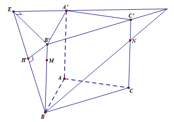 Kẻ \(B'E \bot A'D\) và \(B'H \bot BE\), suy ra \(B'H \bot \left( {A'BN} \right)\), do đó $d\left( {B';\left( {A'BN} \right)} \right) = B'H$.