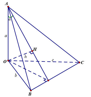 Đặt \(a = OA\), \(b = OB\), \(c = OC\), \(h = OH\) thì \(\dfrac{1}{{{h^2}}} = \dfrac{1}{{{a^2}}} + \dfrac{1}{{{b^2}}} + \dfrac{1}{{{c^2}}}\)và