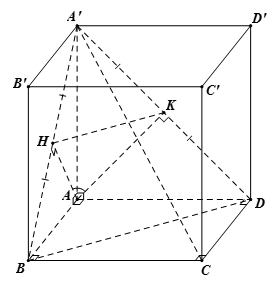 Ta có: \(AH \bot \left( {BA'C} \right),\,AK \bot \left( {DA'C} \right)\) với \(H,\,K\) lần lượt là trung điểm của \(A'B,\,A'D\)