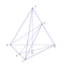 Vì \(AH \bot \left( {BCD} \right)\) nên \(\widehat {\left( {AD;\,\left( {BCD} \right)} \right)} = \widehat {ADH} = 45^\circ \). Đồng thời \(H\) nằm giữa \(D\) và \(M\) nên \(\widehat {AMD} < 90^\circ \) suy ra \(N\) nằm giữa \(A\) và \(D\).