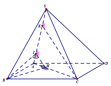 - Dựng \(HI \bot SA\) tại $I$\( \Rightarrow SA \bot \left( {BHI} \right)\)\( \Rightarrow \widehat {BIH}\) là góc giữa hai mặt phẳng $\left( {SAB} \right)$ và $\left( {SAC} \right)$.