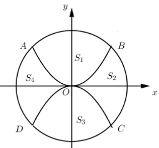 Sân trường THPT Chuyên Hà Giang có một bồn hoa hình tròn có tâm O. Một nhóm học sinh lớp 12 được giao thiết kế bồn hoa, nhóm này chia bồn hoa thành bốn phần, bởi hai đường Parabol có cùng đỉnh O và đối xứng nhau qua O. Hai đường Parabol này cắt đường tròn tại bốn điểm A, B, C, D tạo thành một hình vuông có cạnh bằng 4m (như hình vẽ). Phần diện tích \(S_1,S_3\) dùng để trồng hoa, phần diện tích \(S_2,S_4\) dùng để trồng cỏ (Diện tích được làm tròn đến hàng phần trăm). Biết kinh phí trồng hoa là \(150.000\) đồng/ \(m^2\), kinh phí trồng cỏ là \(100.000\) đồng/ \(m^2\). Hỏi cả trường cần bao nhiêu tiền để trồng bồn hoa đó? (Số tiền làm tròn đến hàng chục nghìn).