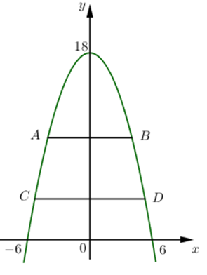 Gọi \({{x}_{A}}=a\Rightarrow {{y}_{A}}=-\frac{1}{2}{{a}^{2}}+18\) \(\Rightarrow \) Phương trình đường thẳng AB : \(y=-\frac{1}{2}{{a}^{2}}+18\) và \({{x}_{C}}=c\Rightarrow {{y}_{c}}=-\frac{1}{2}{{c}^{2}}+18\) \(\Rightarrow \) Phương trình đường thẳng CD : \(y=-\frac{1}{2}{{c}^{2}}+18\).