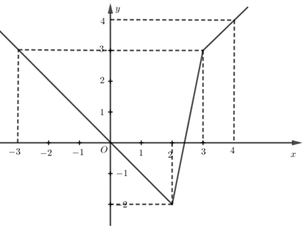 Ta có \(y = \left\{ \begin{array}{l}x\,\,\,\,\,\,\,\,\,\,\,\,\,\,\,\,khi\,\,x \ge 3\\5x - 12\,\,\,\,khi\,\,2 < x < 3\\ - x\,\,\,\,\,\,\,\,\,\,\,\,\,khi\,\,x \le 2\end{array} \right.\)