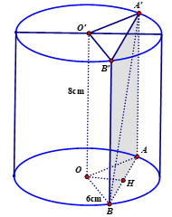 Mà \(AH = \sqrt {O{A^2} - O{H^2}} = 2\sqrt 5 \) \(\Rightarrow AB = 4\sqrt 5 \Rightarrow {S_{ABB'A'}} = 32\sqrt 5 \)