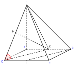 Vì \(KD\,{\rm{//}}\,BI\) nên góc giữa hai đường thẳng \(BI\) và \(SD\) bằng góc giữa hai đường thẳng \(KD\) và \(SD\) và là góc \(\widehat {SDK}\).